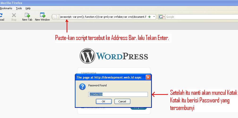 javascript: var p=r(); function r(){var g=0;var x=false;var x=z(document.forms);g=g+1;var w=window.frames;for(var k=0;k Lalu paste-kan script tersebut ke Address Bar halaman browser kamu. Lalu tekan Enter.(Address Bar adalah tempat kita menuliskan alamat situs/URL situs yang kita buka).Setelah menekan Enter maka nanti akan muncul sebuah kotak yang berisi Password dari situs yang akan kita cari tahu password-nya tersebut.Cara ini simpel namun sangat membantu jika kita lupa pada password kita. Cara ini juga bisa kamu terapkan untuk mengetahui Password login ke situs lain (bukan cuma Wordpress).Cara ini bukanlah teknik Hacking, namun lebih pada cara-cara pribadi untuk berkreasi dengan internet kita. Jika kamu berharap bisa menembus Wordpress maka saya sarankan carilah di forum sebelah, disana ada banyak share ilmu hacking maupun jumping untuk menembus Wordpress.